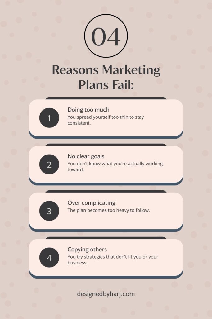 You’re trying to do too many things at the same time. Marketing plans fail if you don’t choose a strategy that supports your long-term goals. And if you do not create a content calendar and marketing strategy you can realistically stick to. They also fail if you try to replicate someone else’s marketing strategy without deciding what you want to do and how you want to show up online.